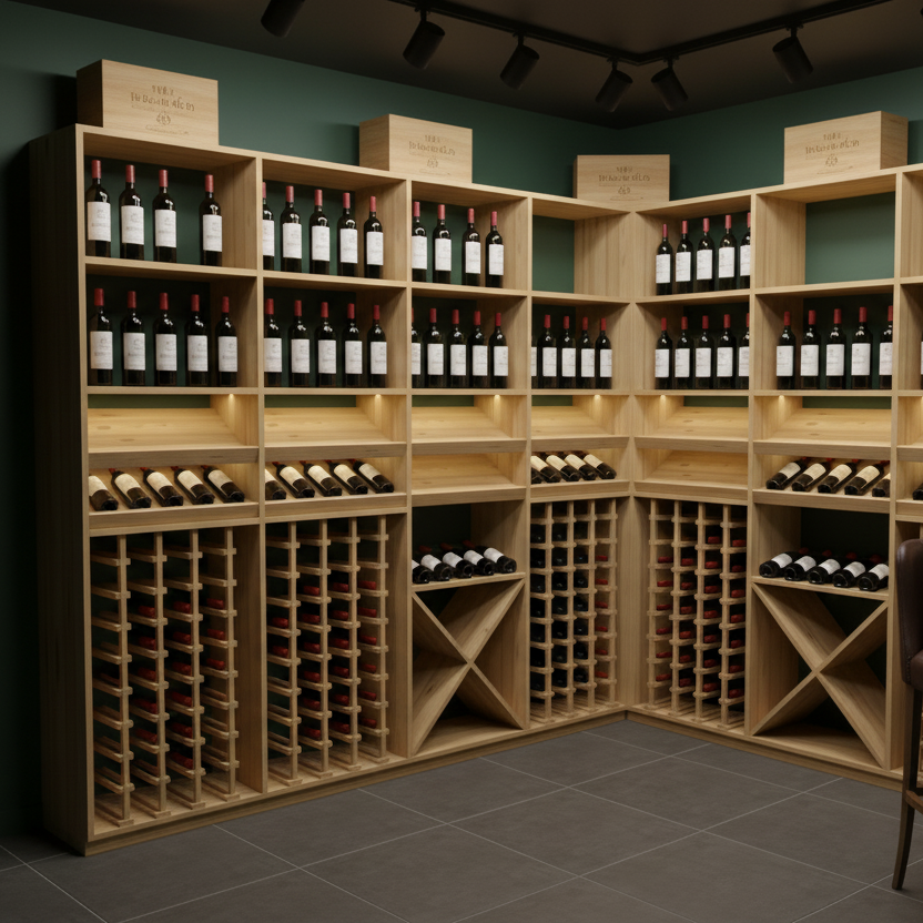 Nos aménagements allient stockage optimisé et élégance de présentation pour des caves professionnelles